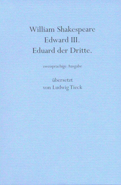 Eduard der Dritte. zweisprachige Ausgabe Übersetzung von Ludwig Tieck [und Wolf von Baudissin] 240 S., Engl. Broschur, 10,- Ja, es ist ein Shakespeare! ... Die Welt der Shakespearologen wird von einem Erdbeben der Stärke 9 auf der Richterskala erschüttert: Den kanonischen Werken des Dramatikers aller Dramatiker muß ein weiteres Stück hinzugefügt werden. Dietrich Schwanitz, DIE WELT Wie auch immer, das Stück war des Ausgegraben-Werdens wert; so wenigstens die Meinung der Fachleute, der Shakespeare-Forscher. Sie haben wohl Recht, es ist viel mit ihm anzufangen. Marion Löhndorf, General-Anzeiger |